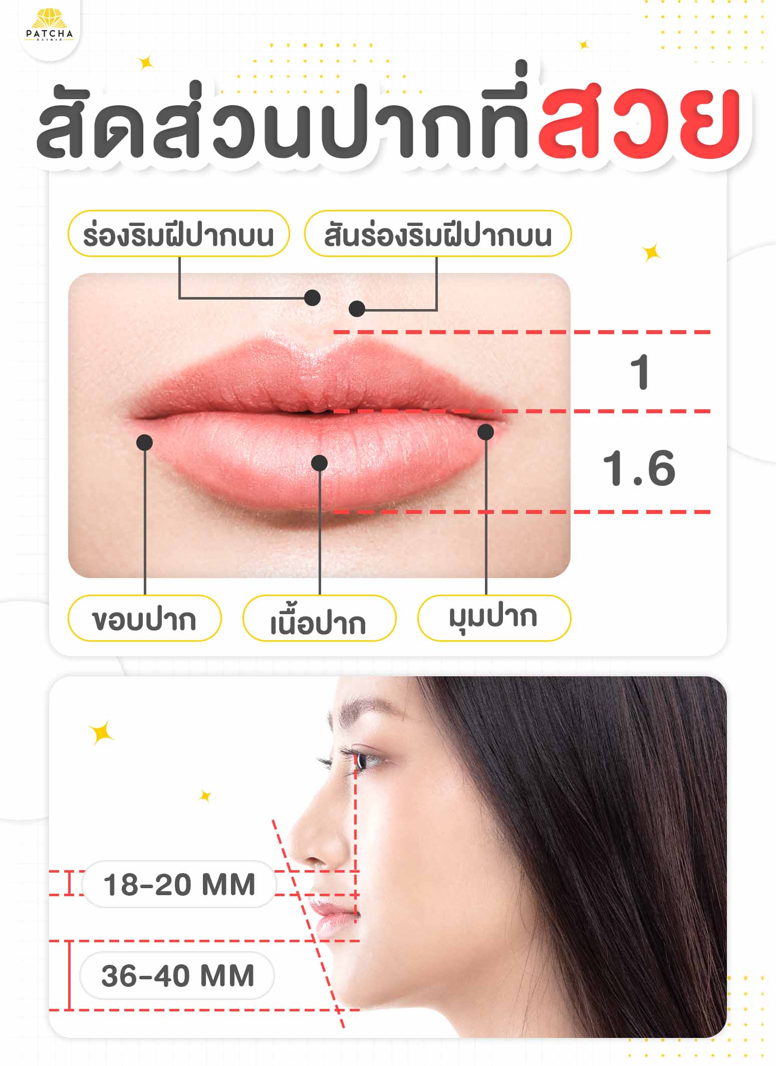สัดส่วนริมฝีปากที่สวยควรที่จะรับกับจุดอื่นๆ บนใบหน้า ซึ่งมีสัดส่วนดังนี้